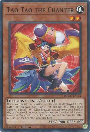 If this card battles a monster, neither can be destroyed by that battle. If you take battle or effect damage: You can Special Summon 1 Level 3 or higher Illusion monster from your hand or GY, or if you took 2000 or more damage, you can Special Summon from your Deck or Extra Deck instead. You can only use this effect of "Tao Tao the Chanter" once per turn.
