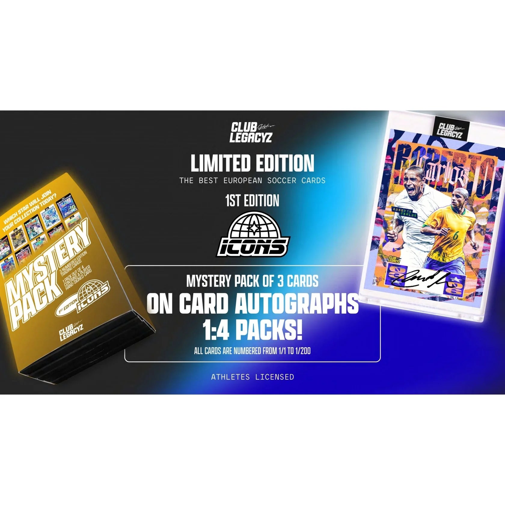 2025 Club Legacyz Icons 1st Edition Soccer Cards delivers (3) Limited Edition Cards, max #'d to 200 in Every Box!