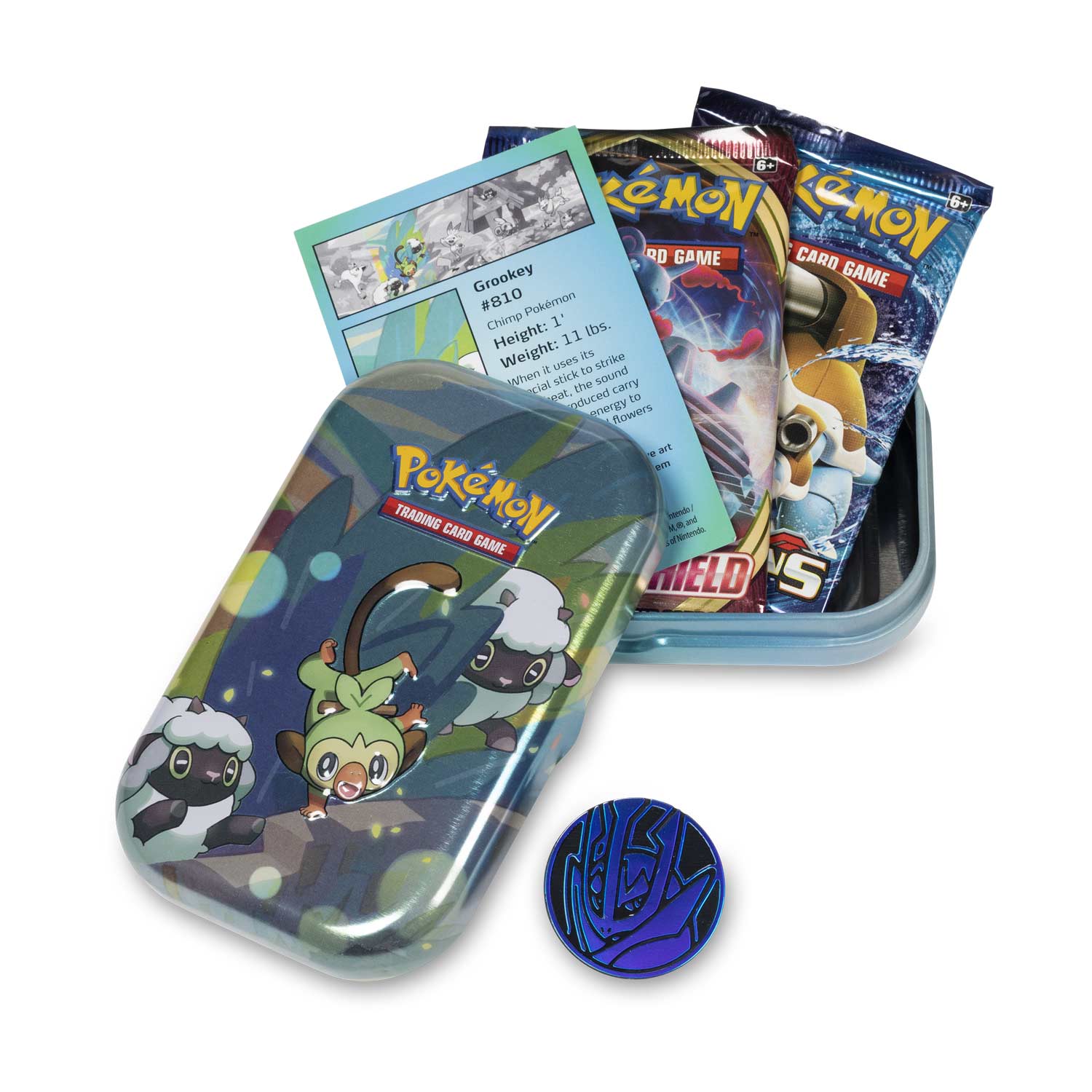 Expand your collection with this Pokémon Trading Card Game: Galar Pals Mini Tin, perfectly sized for taking your favorite cards on the go! This fantastic tin is easy to open and features Grookey & Wooloo in one of five fun Pokémon illustrations—and all five form a single image when you line them up!