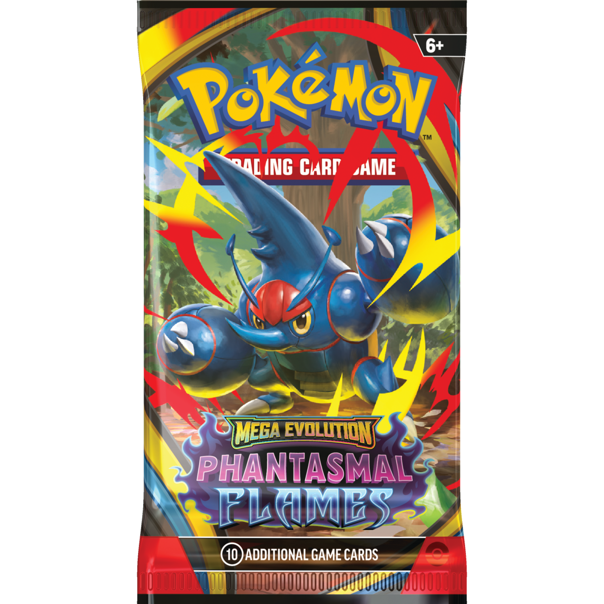 Searing blue flames rip across a dark battlefield at Emmett's ToyStop as Mega Charizard X ex soars up and looks down upon its opponents! With a deep chill to rival the heat, the shadowy figure of Mega Gengar ex slowly rises into view, and both Pokémon prepare to attack. Determined to prove their mettle, Mega Heracross ex, Mega Lopunny ex, and even more Pokémon line up to give it their all in the Pokémon TCG: Mega Evolution—Phantasmal Flames expansion!