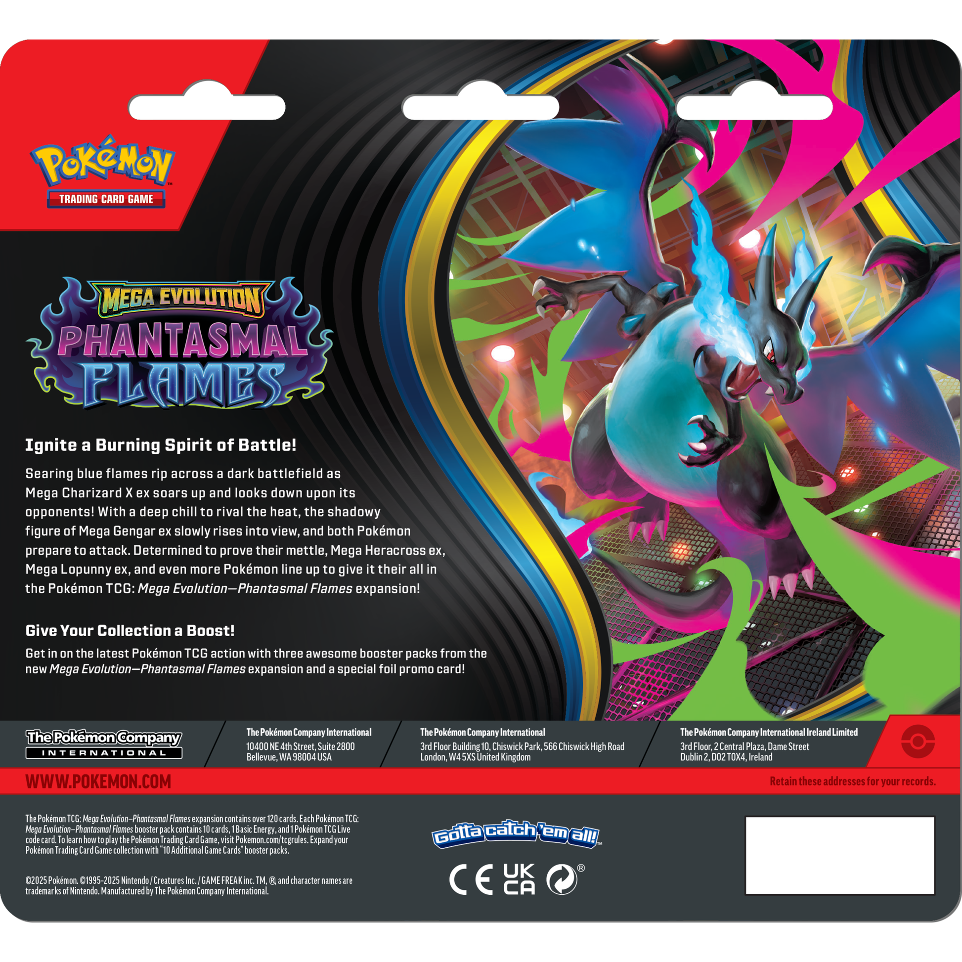 Searing blue flames rip across a dark battlefield at Emmett's ToyStop as Mega Charizard X ex soars up and looks down upon its opponents! With a deep chill to rival the heat, the shadowy figure of Mega Gengar ex slowly rises into view, and both Pokémon prepare to attack. Determined to prove their mettle, Mega Heracross ex, Mega Lopunny ex, and even more Pokémon line up to give it their all in the Pokémon TCG: Mega Evolution—Phantasmal Flames expansion!